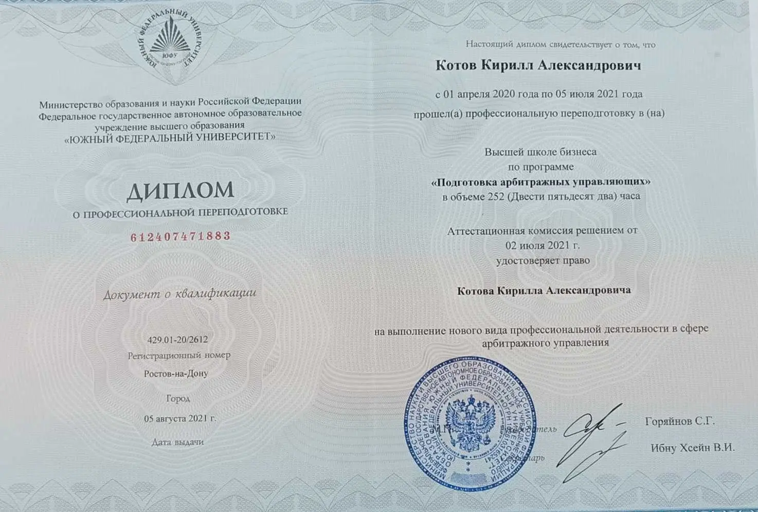 Диплом о повышении квалификации и прохождении обучения по профессии Арбитражный управляющий