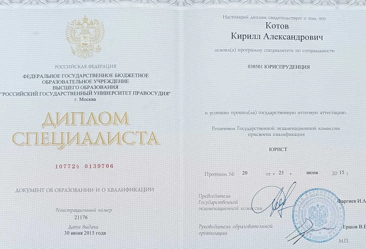 Этот документ подтверждает, что вашим делом будет заниматься дипломированный юрист, который окончил Специальное Московское учебное заведение, по подготовке кадров для судебной системы, основанное Верховным судом Российской Федерации.