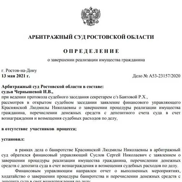 Завершение процедуры банкротства и списание долгов.