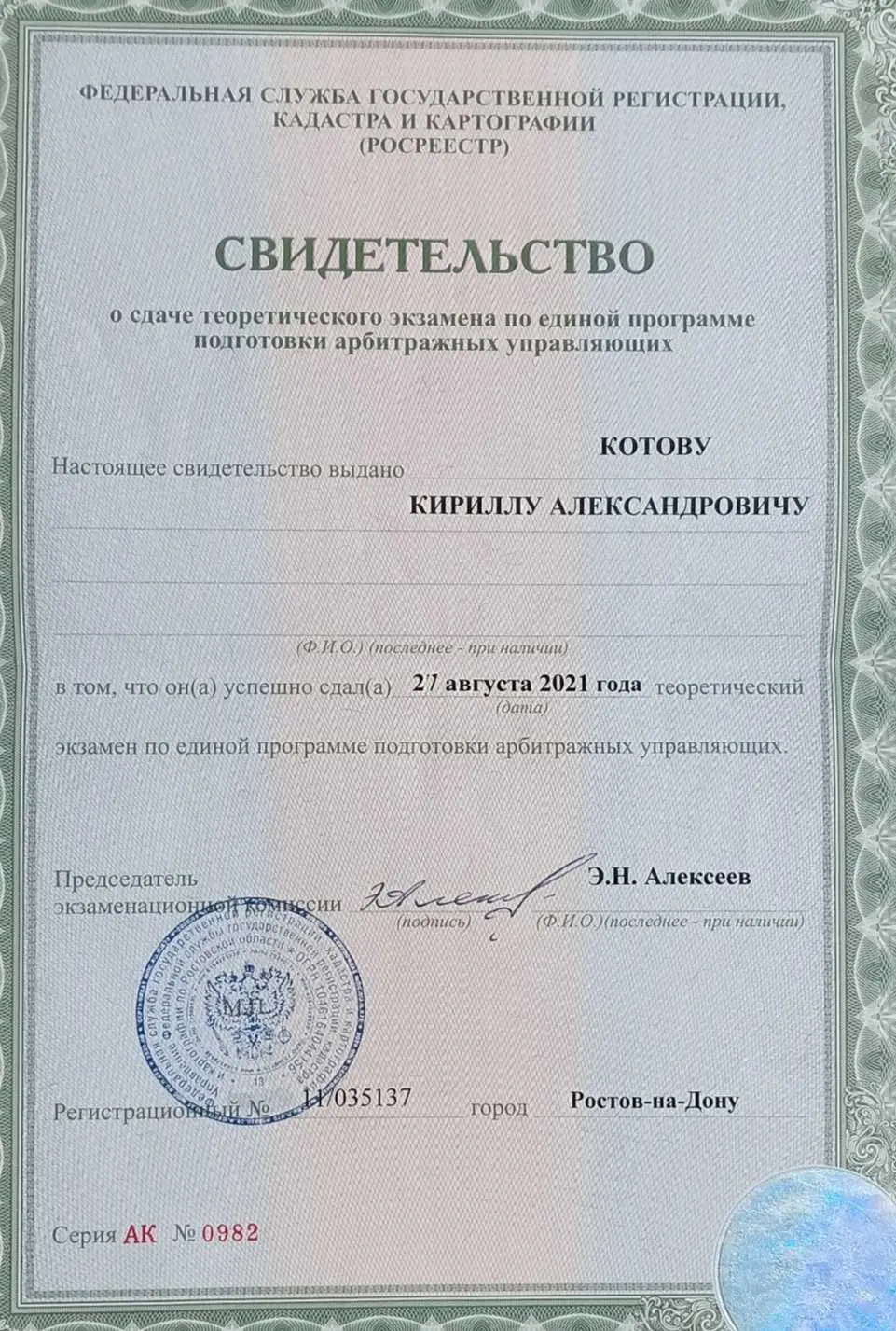 Этот документ подтверждает, что юрист сдал квалификационный экзамен в Государственном Росреестре и теперь имеет право заниматься банкротством на законных основаниях.