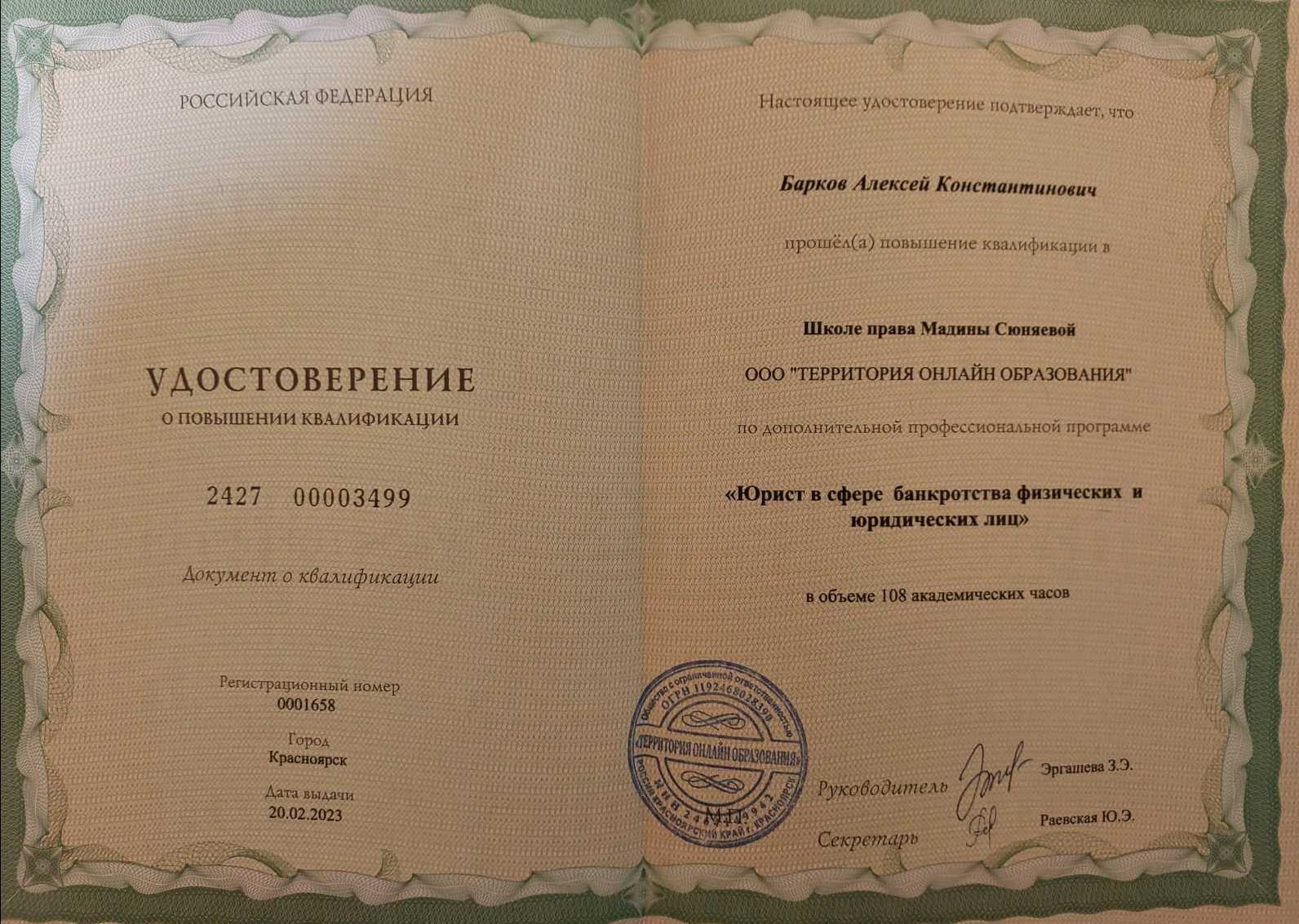 Этот документ, подтверждает, что вашим делом будет заниматься юрист, который изучил курс по государственной программе обучения специалистов для банкротства и обладает всеми необходимыми знаниями.