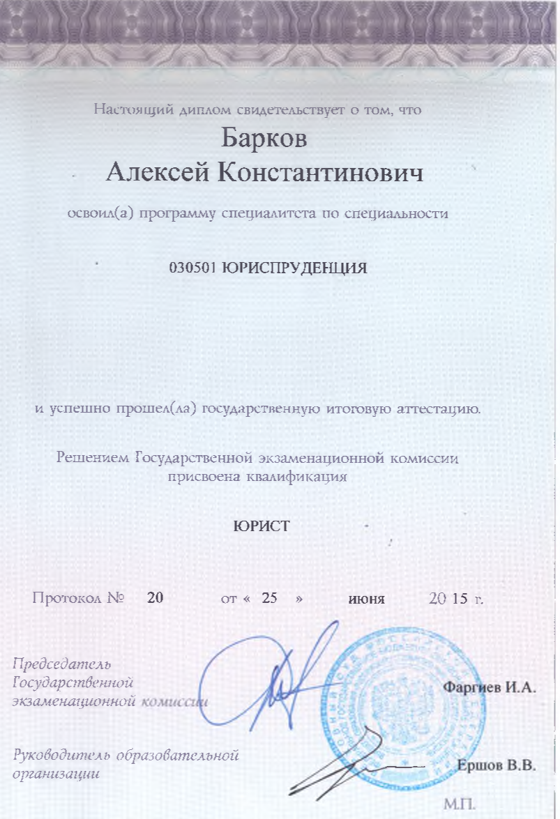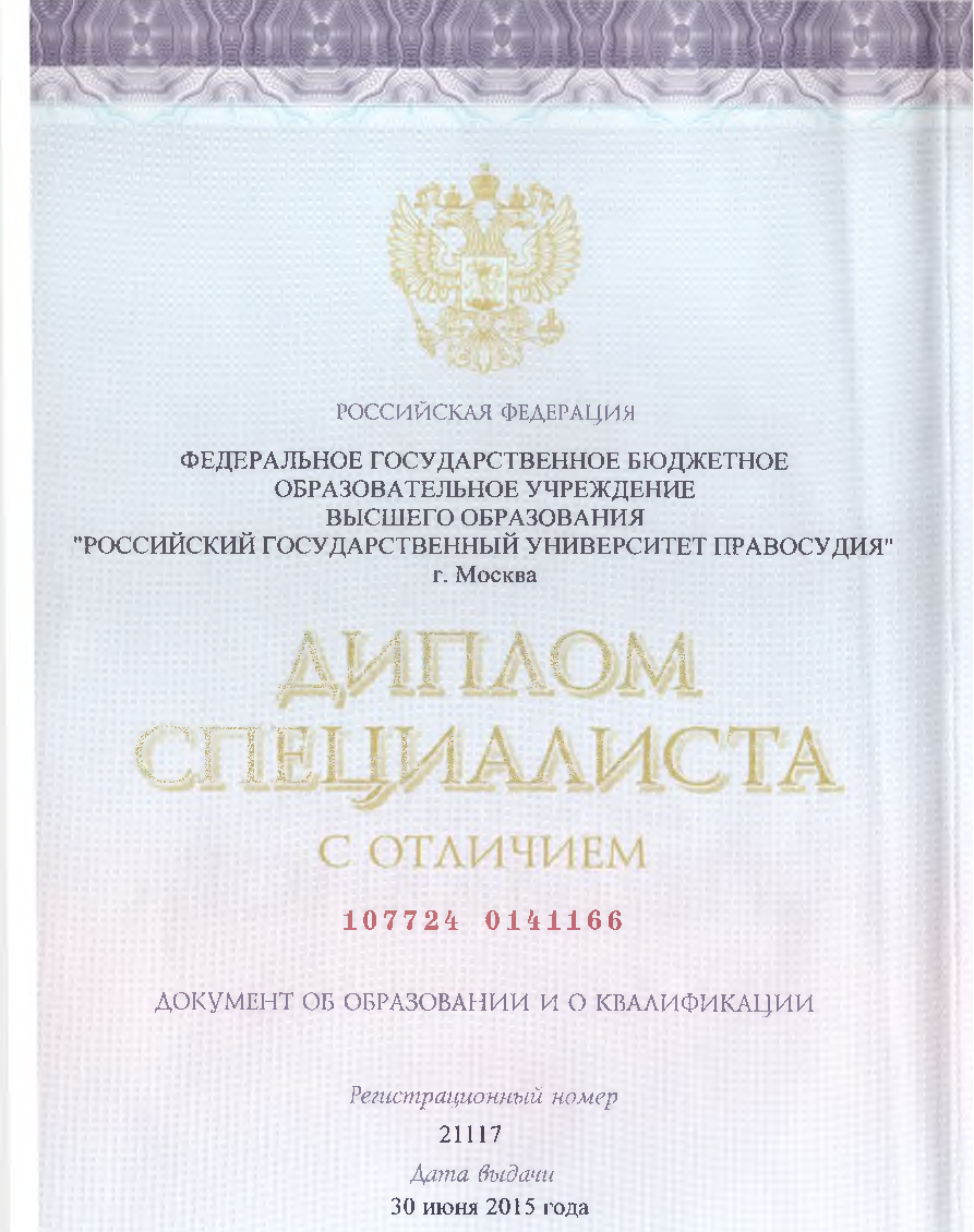 Этот документ подтверждает, что вашим делом будет заниматься дипломированный юрист, который окончил Специальное Московское учебное заведение, по подготовке кадров для судебной системы, основанное Верховным судом Российской Федерации.